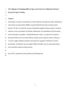 The challenge of navigating different spaces and contexts in collaborative doctoral research in sport coaching.pdf - Accepted Version Available under License Creative Commons Attribution Non-commercial No Derivatives. Download (286kB) | Preview |