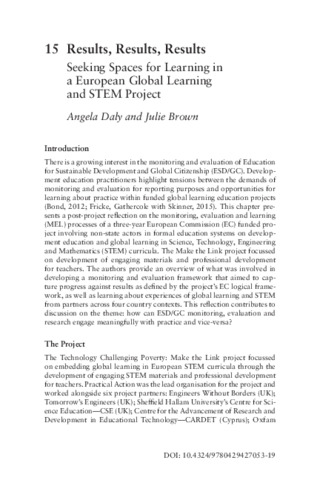 Daly, A and Brown, J (2019) Results, results, results: seeking spaces for learning in a European global learning and STEM project. In: Bamber, P, (ed.) Teacher education for sustainable development and global citizenship: critical approaches to curriculum, values and assessment. Routledge. ISBN 9781138385511