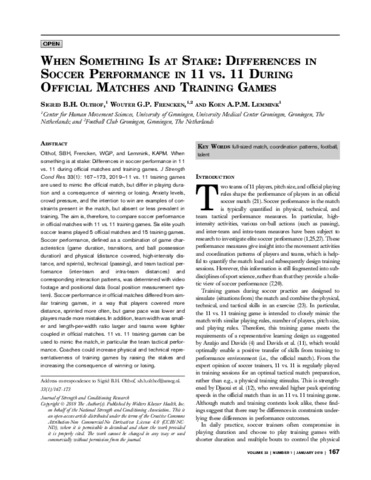 Olthof, SBH, Frencken, WGP, and Lemmink, KAPM. When something is at stake: Differences in soccer performance in 11 vs. 11 during official matches and training games. J Strength Cond Res 33(1): 167-173, 2019-11 vs. 11 training games are used to mimic the official match, but differ in playing duration and a consequence of winning or losing. Anxiety levels, crowd pressure, and the intention to win are examples of constraints present in the match, but absent or less prevalent in training. The aim is, therefore, to compare soccer performance in official matches with 11 vs. 11 training games. Six elite youth soccer teams played 5 official matches and 15 training games. Soccer performance, defined as a combination of game characteristics (game duration, transitions, and ball possession duration) and physical (distance covered, high-intensity distance, and sprints), technical (passing), and team tactical performance (inter-team and intra-team distances) and corresponding interaction patterns, was determined with video footage and positional data (local position measurement system). Soccer performance in official matches differed from similar training games, in a way that players covered more distance, sprinted more often, but game pace was lower and players made more mistakes. In addition, team width was smaller and length-per-width ratio larger and teams were tighter coupled in official matches. 11 vs. 11 training games can be used to mimic the match, in particular the team tactical performance. Coaches could increase physical and technical representativeness of training games by raising the stakes and increasing the consequence of winning or losing.