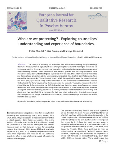 Blundell, P, Oakley, L and Kinmond, K (2022) Who are we protecting? - Exploring counsellors’ understanding and experience of boundaries. European Journal of Qualitative Research in Psychotherapy, 12. pp. 13-28. ISSN 1756-7599
