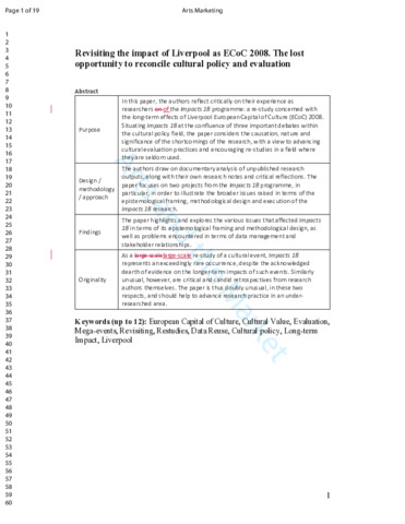 Revisiting the impact of Liverpool as ECoC 2008 the lost opportunity to reconcile cultural policy and evaluation.PDF - Accepted Version Available under License Creative Commons Attribution Non-commercial. Download (227kB) | Preview |