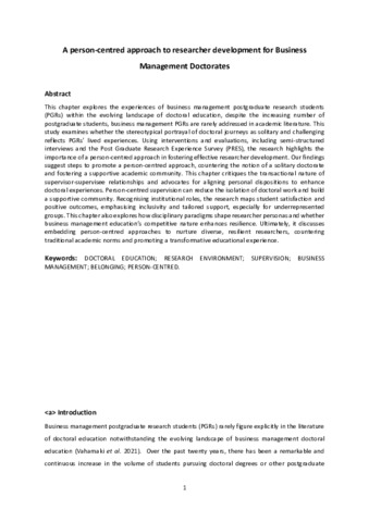 This chapter explores the experiences of business management postgraduate research students (PGRs) within the evolving landscape of doctoral education. Despite the increasing number of postgraduate students, business management PGRs are rarely addressed in academic literature. This study examines whether the stereotypical portrayal of doctoral journeys as solitary and challenging reflects PGRs' lived experiences. Using interventions and evaluations, including semi-structured interviews and the Post Graduate Research Experience Survey (PRES), the research highlights the importance of a person-centred approach in fostering effective researcher development. Our findings suggest steps to promote a person-centred approach, countering the notion of a solitary doctorate and fostering a supportive academic community. This chapter critiques the transactional nature of supervisor-supervisee relationships and advocates for aligning personal dispositions to enhance doctoral experiences. Person-centred supervision can reduce the isolation of doctoral work and build a supportive community. Recognising institutional roles, the research maps student satisfaction and positive outcomes, emphasising inclusivity and tailored support, especially for underrepresented groups. This chapter also explores how disciplinary paradigms shape researcher personas and whether business management education’s competitive nature enhances resilience. Ultimately, it discusses embedding person-centred approaches to nurture diverse, resilient researchers, countering traditional academic norms and promoting a transformative educational experience.