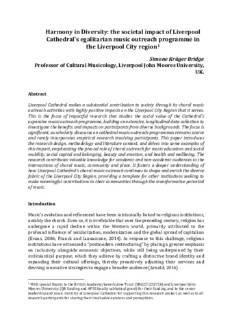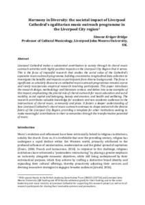 Harmony in Diversity the societal impact of Liverpool Cathedrals egalitarian music outreach programme in the Liverpool City region.pdf - Published Version Available under License Creative Commons Attribution. Download (520kB) | Preview |