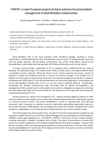 Given this background, the European Union, through the Horizon Europe research programme, has funded the "Health Virtual Twins for the Personalised Management of Stroke Related to Atrial Fibrillation” (TARGET) project (grant agreement no. 101136244). TARGET’s consortium involves nineteen partners including universities, hospitals, companies and a charity. The project kicked-started in January 2024 under the scientific leadership of Prof Sandra Ortega-Martorell (Principal Investigator, Liverpool John Moores University, LJMU), the methodological leadership in AI and virtual twins of Prof Ivan Olier (LJMU), the clinical leadership in AF and stroke of Prof Gregory Lip (University of Liverpool), and the coordination of Prof Mattias Ohlsson (Lund University).
