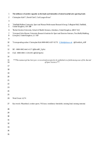 | Additional Information: | This is an Accepted Manuscript version of the following article, accepted for publication in Journal of Sports Sciences. Kirk, C., Clark, D., & Langan-Evans, C. (2024). The influence of aerobic capacity on the loads and intensities of mixed martial arts sparring bouts. Journal of Sports Sciences, 1–10. https://doi.org/10.1080/02640414.2024.2419239. It is deposited under the terms of the Creative Commons Attribution-NonCommercial-NoDerivatives License (Deed - Attribution-NonCommercial-NoDerivatives 4.0 International - Creative Commons ), which permits non-commercial re-use, distribution, and reproduction in any medium, provided the original work is properly cited, and is not altered, transformed, or built upon in any way. |