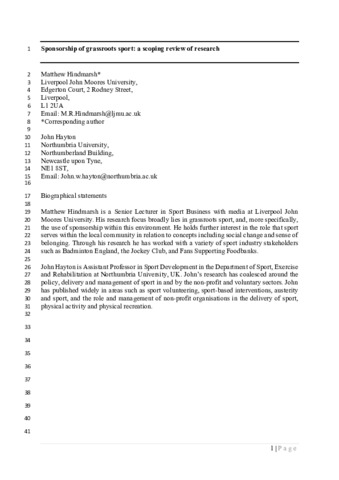 Sponsorship of grassroots sport a scoping review of research.pdf - Accepted Version Download (441kB) | Preview |
