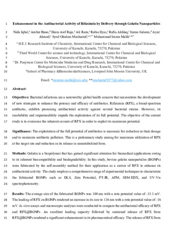 Enhancement in the Antibacterial Activity of Rifaximin by Delivery through Gelatin Nanoparticles.pdf - Accepted Version Available under License Creative Commons Attribution Non-commercial No Derivatives. Download (1MB) | Preview |