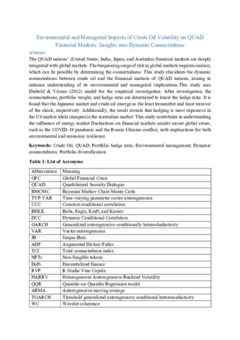 Environmental and Managerial Impacts of Crude Oil Volatility on QUAD Financial Markets Insights into Dynamic Connectedness.pdf - Accepted Version Available under License Creative Commons Attribution Non-commercial No Derivatives. Download (589kB) | Preview |
