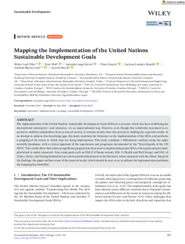 The implementation of the United Nations’ Sustainable Development Goals (SDGs) is a process which has been mobilising the international community – and resources – in an unprecedented way. But even though this world wide movement is expected to mobilise stakeholders from across all sociatey, it remains unclear how this process is yielding the expected results. In an attempt to address this knowledge gap, this study examines the literature on the implementation of the SDGs and performs a mapping of the extent to which they are being implemented. This study combines a bibliometric analysis using the major scientific databases, with a critical appraisal of the experiences and progresses documented in the “Encyclopedia of the UN SDGs”. The results show that whereas significant progress has been seen in implementing some SDGs, other goals remain under-prioritised or under-resourced. Also, some goals such as SDG13 (Climate action), SDG 3 (Health and Well Being), and SDG 16 (Peace, Justice, and Strong Institutions) are more prominently present in the literature, when compared with the others. Based on the findings, the paper outlines some of the research needs which should be met, so as to address the implementation problems the mapping has identified.