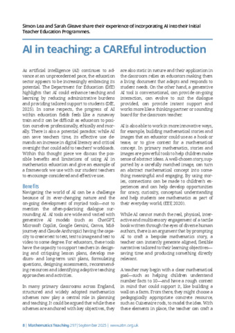 Lea, S and Gleave, S (2025) AI in Teaching: A CAREful Introduction. Mathematics Teaching, 297. pp. 8-11.