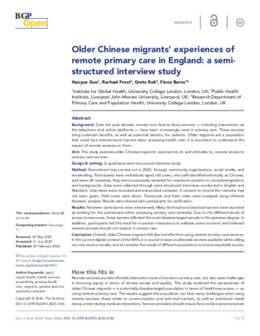 Background: Over the past decade, remote (non- face- to- face) services — including interactions via the telephone and online platforms — have been increasingly used in primary care. These services bring potential benefits, as well as potential barriers, for patients. Older migrants are a population that could face intersectional barriers when accessing health care; it is important to understand the impact of remote services on them. Aim: This study explores older Chinese migrants’ experiences of, and attitudes to, remote access to primary care services. Design & setting: A qualitative semi- structured interview study. Method: Recruitment was carried out in 2023, through community organisations, social media, and snowballing. Participants were individuals aged ≥60 years, who self- identified ethnically as Chinese, and were UK residents; they were purposively sampled for maximum variation in sociodemographics and backgrounds. Data were collected through semi- structured interviews conducted in English and Mandarin. Interviews were recorded and transcribed verbatim; if consent to record the interview had not been given, field notes were taken. Transcripts and field notes were analysed using reflexive thematic analysis. Results were shared with participants for verification.