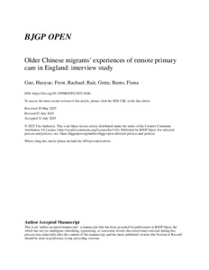 Conclusions Overall, older Chinese migrants feel few benefits from using remote primary care services. In the current digital context of the NHS, it is crucial to keep multimodal services available while rolling out new service modes and consider the needs of different populations to ensure equity in access.