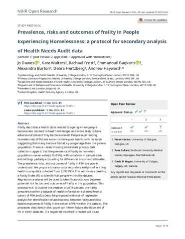 Additional Information: | Copyright: © Crown copyright, 2024 Dawes J et al.. This open access work is licensed under the Open Government Licence v3.0 Open Government Licence logo How to cite: Dawes J, Walters K, Frost R et al. Prevalence, risks and outcomes of frailty in People Experiencing Homelessness: a protocol for secondary analysis of Health Needs Audit data [version 1; peer review: 2 approved, 1 approved with reservations]. NIHR Open Res 2024, 4:9 (https://doi.org/10.3310/nihropenres.13545.1) |