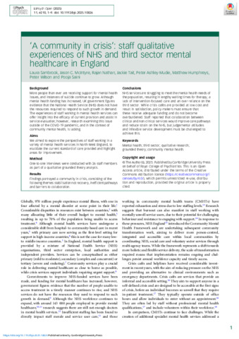 A community in crisis staff qualitative experiences of NHS and third sector mental healthcare in England.pdf - Published Version Available under License Creative Commons Attribution. Download (350kB) | Preview |