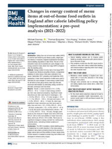 Changes in energy content of menu items at out of home food outlets in England after calorie labelling policy implementation.pdf - Published Version Available under License Creative Commons Attribution. Download (950kB) | Preview |