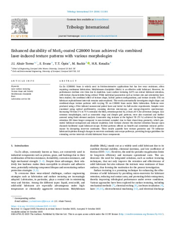 Enhanced durability of MoS 2coated C28000 brass achieved via combined laser induced texture patterns with various morphologies.pdf - Published Version Available under License Creative Commons Attribution. Download (21MB) | Preview  |
