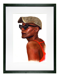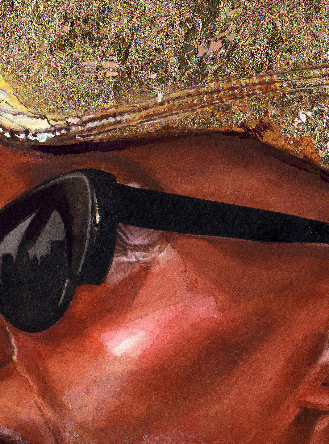 My work is concerned with challenging the recurrent female stereotypes that permeate Western visual culture, where women and girls are frequently represented as erotic, sexualized, infantilized, vulnerable or submissive, in imagery designed to satisfy the male gaze. This watercolour portrait of Nicole Denny, highlighted with imitation gold leaf, is one of a series that celebrates nonconformist approaches to female personal style. I believe it is important to highlight and showcase the valuable contribution these women make to the broader landscape of contemporary style and culture as an antidote to the familiar, patriarchally prescribed visions of women in the mainstream media and visual arts.