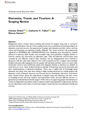 Dementia Travel and Tourism A Scoping Review.pdf - Published Version Available under License Creative Commons Attribution. Download (727kB) | Preview |