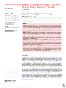 Methods The study was undertaken in the Northwest of England. Fourteen semi- structured interviews were undertaken with 17 parents (three joint interviews) who had experienced perinatal loss and had engaged with perinatal palliative care services. Semi-structured interviews were used to gather insights into their perceptions of care they received, focusing on issues such as communication, the timing of referrals, and the emotional and practical support provided. Data was analysed using a thematic analysis approach. Ethical approval was obtained REC reference: 22/YH/0028