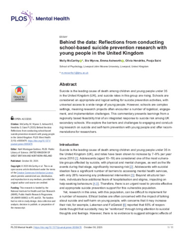 Behind the data Reflections from conducting school based suicide prevention research with young people in the United Kingdom.pdf - Published Version Available under License Creative Commons Attribution. Download (287kB) | Preview |