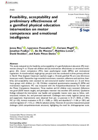 rice et al 2025 feasibility acceptability and preliminary effectiveness of a gamified physical education intervention.pdf - Published Version Available under License Creative Commons Attribution Non-commercial. Download (859kB) | Preview |