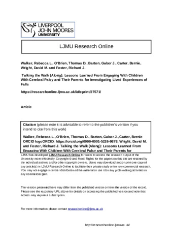 Talking the Walk (Along): Lessons Learned From Engaging With Children With Cerebral Palsy and Their Parents for Investigating Lived Experiences of Falls.