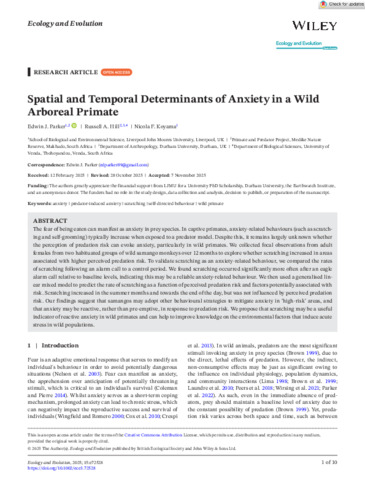 Ecology and Evolution - 2025 - Parker - Spatial and Temporal Determinants of Anxiety in a Wild Arboreal Primate (2).pdf - Published Version Available under License Creative Commons Attribution. Download (356kB) | Preview |