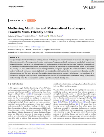 This paper argues for the importance of centring mothers in the design and conceptualisation of ‘care-full’ and compassionate cities and communities. Focusing primarily on the experiences of pregnancy and early motherhood - particularly in relation to babies and toddlers - it reviews and unites literature on motherhood on the move and ‘caringscapes’, including caring and care-full cities and compassionate communities. While existing literature on compassionate communities has largely focused on the frail, elderly, and those with disabilities or life-limiting conditions, this paper highlights the need to also address the specific needs of mothers. It emphasises maternal physical, emotional, and mental health as key considerations in designing care-full urban environments. The paper advocates for mobility designs that prioritise mothers - whether they are travelling with or without their young children - within the framework of care-full cities and compassionate communities, aiming to create more mother-friendly cities that possess distinct qualities beyond those of child-friendly cities.