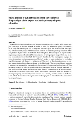 This longitudinal study challenges the assumption that an expert teacher with strong subject knowledge is the best solution to a lack of what the inspection agency Ofsted refer to as ‘deep and meaningful RE’ in England. The first cycle was a small-scale participatory action research project with five student teachers on an initial primary education (ITE) postgraduate degree course in the North-West of England. The concept of an expert teacher in primary religious education (RE) was explored by critiquing an image which had colonial connotations from the 2024 RE Council’s Handbook. The participants engaged in group discussions, beginning a process of Freire’s notion of conscientisation, by exploring what Biesta might call their own ‘subject-ness’. The result of the discussion was a co-created image designed to replace the image in the Handbook. The co-created image presents a pedagogical approach for use not just in the primary RE classroom but in primary ITE to encourage aspects of reflexivity and subjectivity through a Freirean dialogic approach. A new iteration of the image has been developed through a second cycle of action research, which consists of three loops: input from a new cohort; reflections from one member of the original group, now an early career teacher; and a meeting with the author of the Handbook, which demonstrates the significance of this project as it resulted in the removal of the original image.