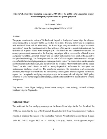 The paper examines the policy of Sir Frederick Lugard to dredge the Lower Niger for all-year-round navigability in the early 1900s. As well as its politics, dredging history and a comparison with the Pearl River and the Mississippi, the River Niger study focused on “Lugard’s colonial imperatives” about the river in contrast to the challenges of its peculiar characteristics vis-à-vis the dynamics of Nigeria’s inland water transport (IWT) market in the post-independence era and the corrupt procurement processes for the dredging campaigns which, concertedly, affected its real and perceived utility. Archival, primary and secondary data sources were used, with qualitative analytical methodology. The findings include the lack of off-take cargoes and commercial voyages even after the latest dredging campaigns, zero opportunity cost of the river system, environmental and host community challenges, and the effects of the so-called “downward march of the Sahara Desert” on the river’s future, as well as ‘nearly-impossible’ milestones in the capital and maintenance dredging objectives. The conclusion compares the operational and commercial problems, the budget constraints and the transparency issues against alternative global models and argues that the episodic dredging campaigns ought to be scrapped and Nigeria’s IWT policy reviewed to avoid further unjustifiable dredging spends in favour of better models of river systems management.