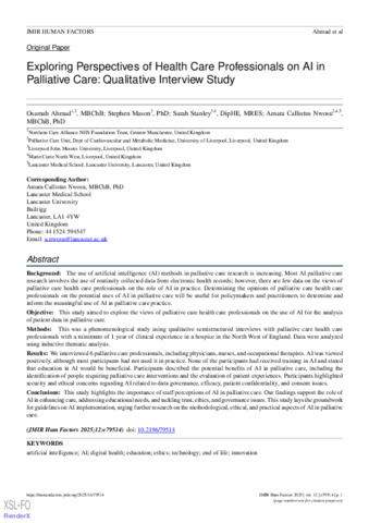 Exploring Perspectives of Health Care Professionals on AI in Palliative Care Qualitative Interview Study.pdf - Published Version Available under License Creative Commons Attribution. Download (251kB) | Preview |