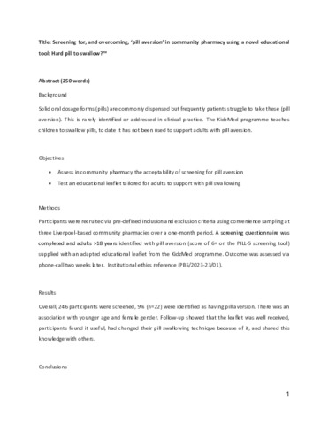 Participants were recruited via pre-defined inclusion and exclusion criteria using convenience sampling at three Liverpool-based community pharmacies over a one-month period. A screening questionnaire was completed and adults >18 years identified with pill aversion (score of 6+ on the PILL-5 screening tool) supplied with an adapted educational leaflet from the KidzMed programme. Successful pill swallowing using the leaflet was assessed via phone-call two weeks later. Institutional ethics reference (PBS/2023-23/01).