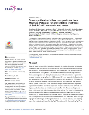 Green synthesized silver nanoparticles from Moringa Potential for preventative treatment of SARS-CoV-2 contaminated water.pdf - Published Version Available under License Creative Commons Attribution. Download (1MB) | Preview |