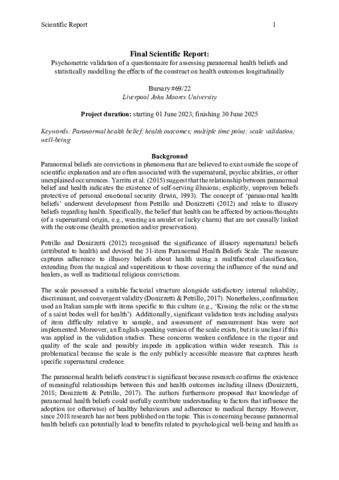 Psychometric validation of a questionnaire for assessing paranormal health beliefs and statistically modelling the effects of the construct on health outcomes longitudinally.