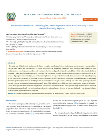 The rapid loss of biodiversity has increased reliance on captive breeding and reintroduction programs to conserve endangered species, yet these efforts face obstacles such as limited veterinary care, inbreeding, skewed sex ratios, and high juvenile mortality. This study examines breeding success and neonate survival in Arabian sand gazelles (Gazella marica) from private collections in Şanlıurfa Province, Turkey, and compares them with data from the King Khalid Wildlife Research Centre (KKWRC) in Saudi Arabia. We assessed offspring sex ratio, litter type, and survival during the first 30 days of life. Private collections showed a much higher frequency of singleton births—especially in first-time mothers—compared with KKWRC herds. Births in private facilities were concentrated between April and July, whereas KKWRC gazelles reproduced over a longer season. Although sex ratios were generally balanced, neonate survival in private collections was markedly lower. This reduced survival likely reflects management issues, including limited veterinary support and maternal inexperience. Overall, the study demonstrates how captive management conditions influence breeding outcomes and early survival in endangered species and emphasizes the need for stronger husbandry practices and reliable veterinary care in private breeding programs.
