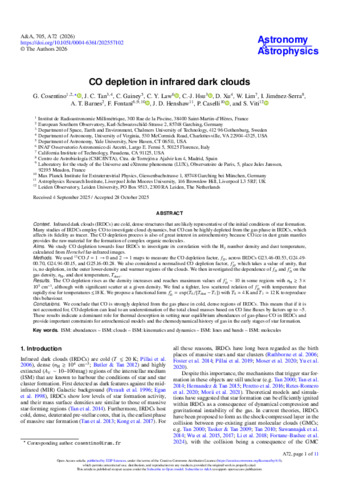 Conclusions. We conclude that CO is strongly depleted from the gas phase in cold, dense regions of IRDCs. This means that if it is not accounted for, CO depletion can lead to an underestimation of the total cloud masses based on CO line fluxes by factors up to ∼5. These results indicate a dominant role for thermal desorption in setting near equilibrium abundances of gas-phase CO in IRDCs and provide important constraints for astrochemical models and the chemodynamical history of gas in the early stages of star formation.