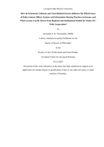 Neumueller, A (2026) How do Structural, Cultural, and Trust-Related Factors Influence the Effectiveness of Police Liaison Officer Systems and Information-Sharing Practices in Europe, and What Lessons Can Be Drawn from Regional and Institutional Models for Future EU Wide Cooperation? Doctoral thesis, Liverpool John Moores University.