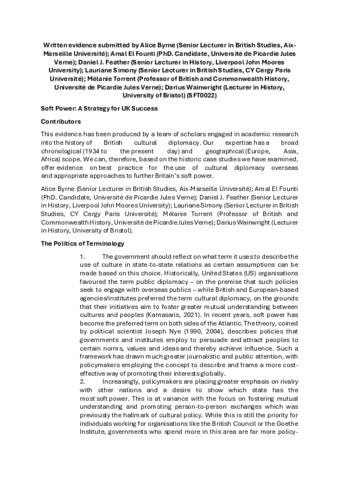 | Additional Information: | © UK Parliament 2025 This Written evidence submitted by Alice Byrne (Senior Lecturer in British Studies, Aix-Marseille Université); Amal El Founti (PhD. Candidate, Université de Picardie Jules Verne); Daniel J. Feather (Senior Lecturer in History, Liverpool John Moores University); Lauriane Simony (Senior Lecturer in British Studies, CY Cergy Paris Université); Mélanie Torrent (Professor of British and Commonwealth History, Université de Picardie Jules Verne); Darius Wainwright (Lecturer in History, University of Bristol) (SFT0022) Soft Power: A Strategy for UK Success is licensed under the Open Government Licence 3.0. |