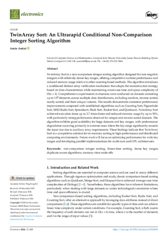 Amini, A (2026) TwinArray Sort: An Ultrarapid Conditional Non-Comparison Integer Sorting Algorithm. Electronics, 15 (3). pp. 1-14. ISSN 2079-9292