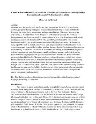 From Russia with Influence An AI-Driven Probabilistic Framework for Assessing Foreign Electoral Interference in US Elections 2016 2036.pdf - Accepted Version Available under License Creative Commons Attribution Non-commercial. Download (534kB) | Preview |
