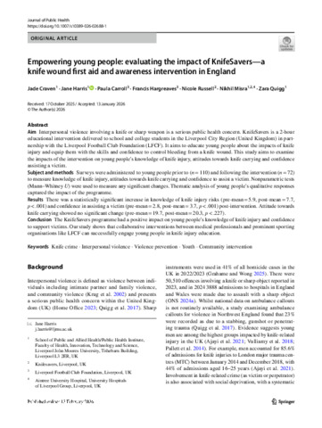 Empowering young people evaluating the impact of KnifeSavers- a knife wound first aid and awareness intervention in England.pdf - Published Version Available under License Creative Commons Attribution. Download (747kB) | Preview |