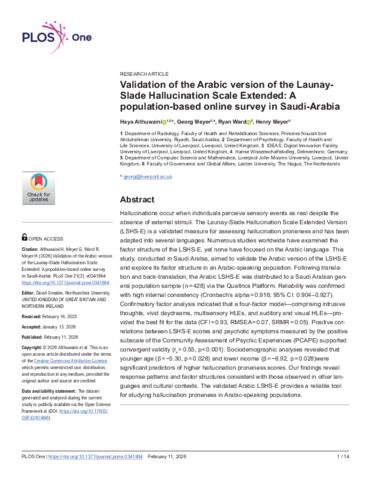 Validation of the Arabic version of the Launay-Slade Hallucination Scale Extended: A population-based online survey in Saudi-Arabia.