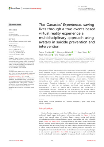 The Canaries Experience- saving lives through a true events based virtual reality experience a multidisciplinary approach using avatars in suicide prevention and intervention.pdf - Published Version Available under License Creative Commons Attribution. Download (1MB) | Preview |