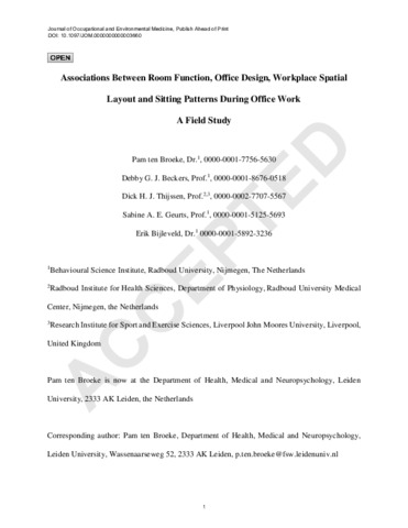 We investigated associations between room function, office design, workplace spatial layout, and office workers’ sitting behavior.