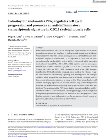Physiological Reports - 2026 - Cole - Palmitoylethanolamide PEA regulates cell cycle progression and promotes an.pdf - Published Version Available under License Creative Commons Attribution. Download (1MB) | Preview |