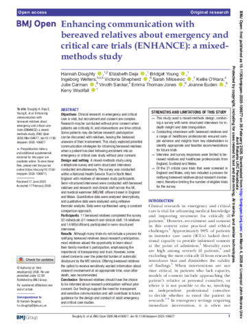 Enhancing communication with bereaved relatives about emergency and critical care trials ENHANCE.pdf - Published Version Available under License Creative Commons Attribution. Download (711kB) | Preview |