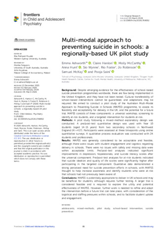 Multi-Modal Approach to Preventing Suicide in Schools (MAPSS) A regionally-based UK pilot study.pdf - Published Version Available under License Creative Commons Attribution. Download (431kB) | Preview |