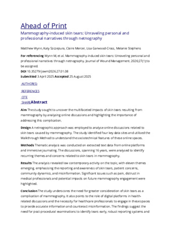 Mammography induced skin tears Unraveling personal and professional narratives through netnography.pdf - Accepted Version Available under License Creative Commons Attribution Non-commercial. Download (1MB) | Preview |