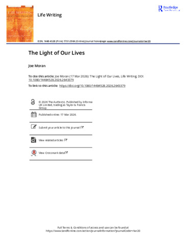 This personal essay explores an overlooked aspect of life writing: light. I explore the different kinds of light in my own life and the life of my grandmother, who was born and raised on an island off the west coast of Ireland, and of my father who spent his summers there as a boy. The island had no electricity, which made the islanders more aware of the fading and return of the light and of its endless, local permutations. I draw on the work of painters and filmmakers who see light’s scarcity as part of the artform, and on life writing by Roland Barthes, John Boorman, John Berger, Elizabeth Bowen and others. What, I ask, does the long human quest for everlasting light mean in an era of light pollution and what Matthew Beaumont calls ‘post-circadian capitalism’? Our turbo capitalist world rests on the fantasy of endless growth, continual betterment, life without end. One task of life writing, in an age of climate emergency, might be to help us accept our own finitude—to concede that our lives are a waking dream, refracted through light.