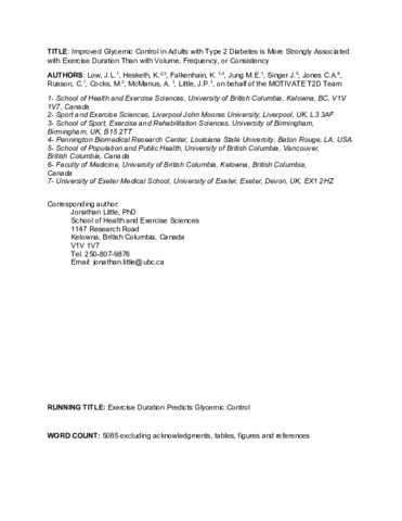 Improved Glycemic Control in Adults with Type 2 Diabetes is More Strongly Associated with Exercise Duration Than with Volume, Frequency, or Consistency.